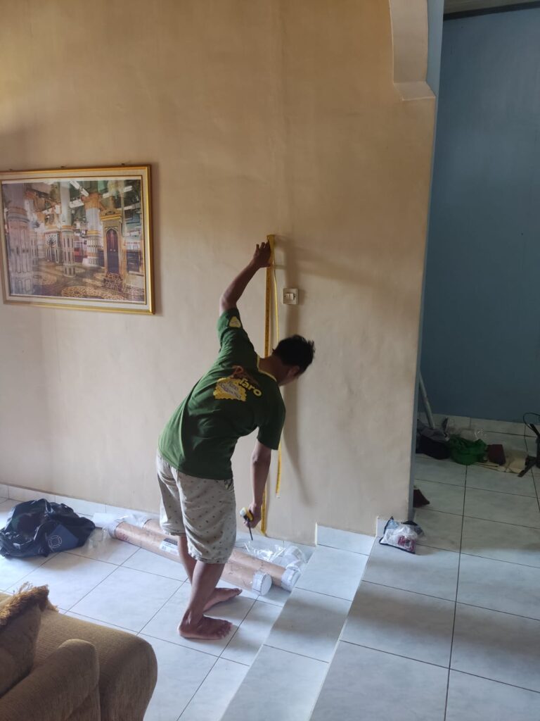 Pemasangan Wallpaper di Jln. astoria Rumah Bapak Pendi. Progress pemasangan dilakukan dengan ketelitian dan mengutamakan kualitas.